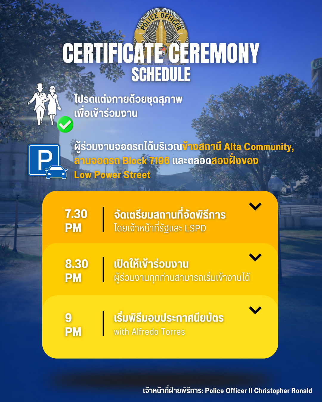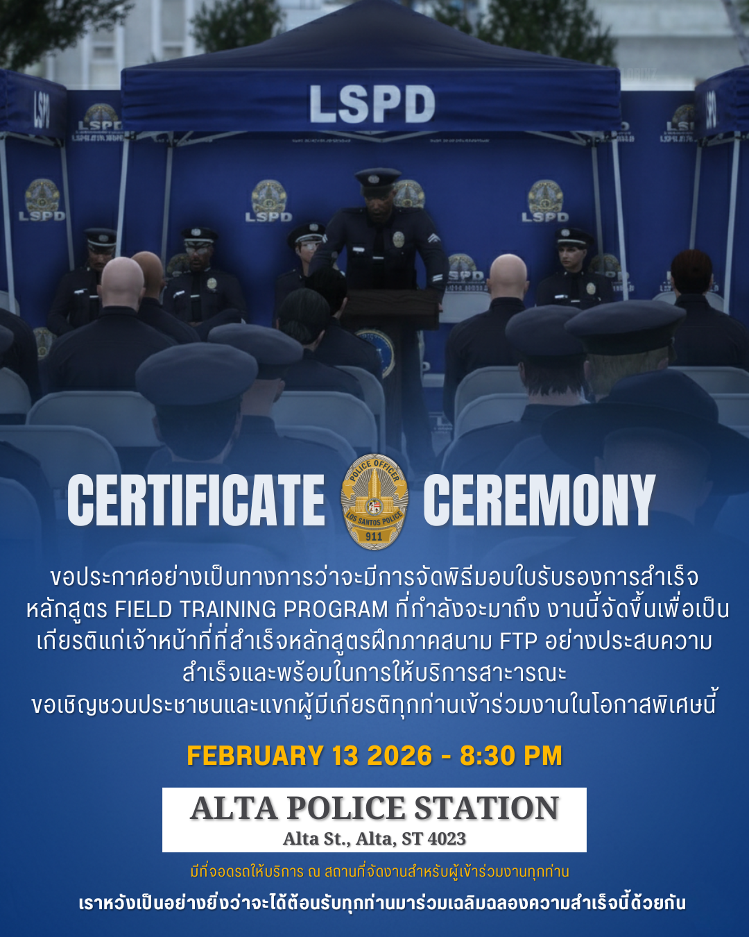 Los Santos Police Department ขอเชิญผู้มีเกียรติและประชาชนร่วมเป็นสักขีพยานในพิธีมอบประกาศนียบัตรแก่เจ้าหน้าที่ผู้สำเร็จการฝึกอบรมประจำปี 📍 สถานที่: Alta Community 🗓 วันที่: 13 กุมภาพันธ์ 2026 กำหนดการโดยสังเขป: 19:30 น. เจ้าหน้าที่และทีมงานเตรียมความพร้อมสถานที่ 20:30 น. เปิดให้แขกผู้มีเกียรติและประชาชนเข้าร่วมงาน 21:00 น. เริ่มพิธีมอบประกาศนียบัตร ผู้เข้าร่วมงานสามารถจอดรถได้บริเวณข้างสถานี Alta Community, ลานจอดรถ Block 7196 และตลอดสองฝั่งของ Low Power Street ขอความร่วมมือแต่งกายสุภาพเพื่อความเหมาะสมของพิธีการ พิธีในครั้งนี้จัดขึ้นเพื่อแสดงความภาคภูมิใจในความสำเร็จของเจ้าหน้าที่ และยกระดับมาตรฐานการปฏิบัติหน้าที่เพื่อความปลอดภัยของประชาชนในเมืองลอสซานโตส สอบถามเพิ่มเติม (เจ้าหน้าที่พิธีการ): Police Officer II Christopher Ronald